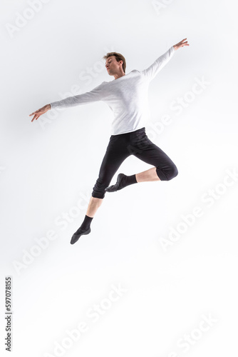 © danmorgan12, Fototapeta premium Professional Caucasian Handsome Young Athlete Man Posing in Flying Ballet Pose with Lifted Hands in White Shirt On White.