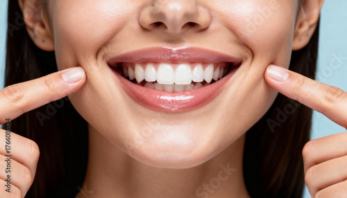 © igor.nazlo, Obraz premium Professional close-up of smiling woman’s mouth showing perfect teeth, index fingers pointing at cheeks, clean pale blue-grey background, banner format