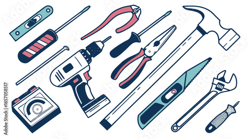 Fototapeta premium Professional Construction and Electrical Equipment Tools Set Vector Illustration with Drill, Pliers, Screwdrivers, Hammers, Saws, Tape Measure, and Wrench