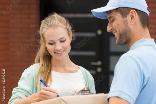 © Photographee.eu, Obraz premium Professional courier and smiling woman signing receipt on box