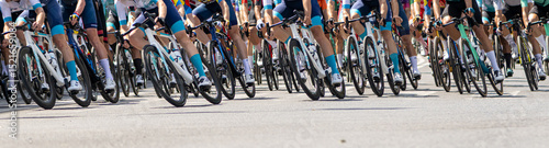 Fototapeta premium Professional cyclists in vibrant uniforms racing outdoors during a high-energy competition with close-up focus on their bicycles in motion.