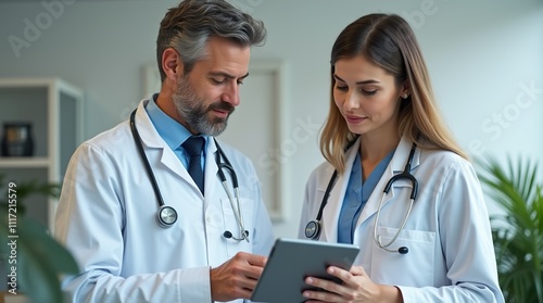 Fototapeta premium Professional doctor and his young female assistant using tablet for discussion prescriptions, working in clinic office.