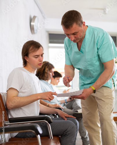 Fototapeta premium Professional doctor showing papers while explaining results of medical examination to young male patient in lobby of clinic