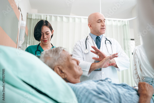 Fototapeta premium professional doctor standing by explain the treatment information via male elderly patient lying in bed in private hospital sickroom. The treatment program is suitable for people to socialize elderly
