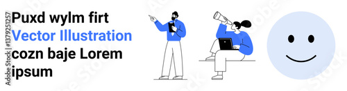 Fototapeta premium Professional duo discussing ideas with a laptop while one uses a telescope. Smiling face emblem symbolizes optimism. Ideal for teamwork, progress, exploration, creativity, collaboration, research
