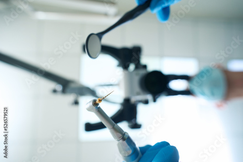 © Svitlana, Obraz premium Professional endodontist performing tooth nerve removal under microscope