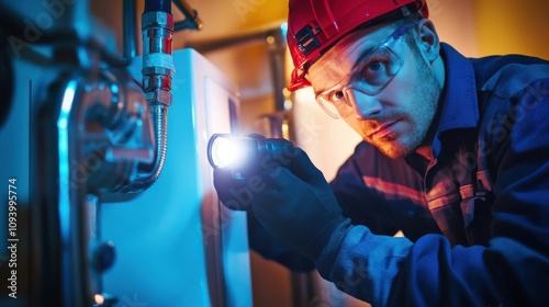 © Chatchanan, Fototapeta premium Professional engineer inspecting a home boiler, wearing safety