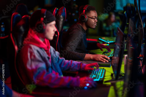 © Anna Kosolapova, Obraz premium Professional esports players at an online game tournament. The cyber team plays computers and trains