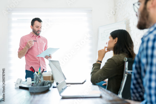 Obraz premium Professional Explaining Project To Colleagues In Office
