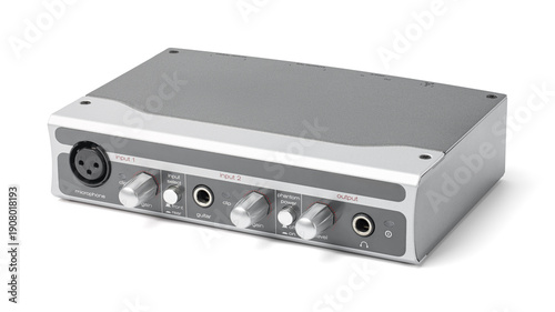 © stas_malyarevsky, Fototapeta premium Professional external USB audio interface for home studio recording and music production, featuring XLR and guitar inputs with silver metal housing isolated on white background.