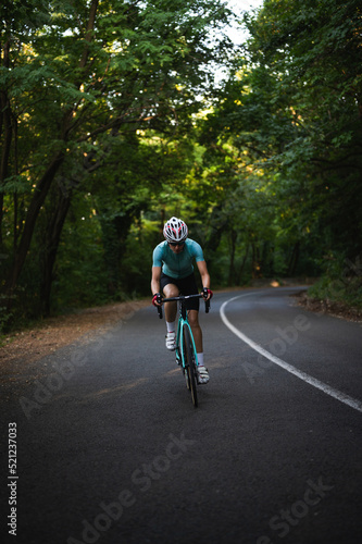 Fototapeta premium Professional female cyclist trains in the woods. Woman riding race bicycle on...
