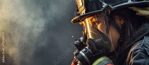© HN Works, Naklejka premium Professional firefighter carefully adjust the straps and positioning of the mask ensuring a secure and comfortable sit on their partner s face. Creative Banner. Copyspace image