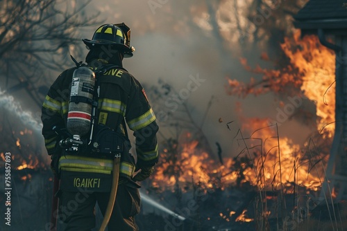 Naklejka premium Professional Firefighter Extinguishing Large, High-Priority Part of the Fire....