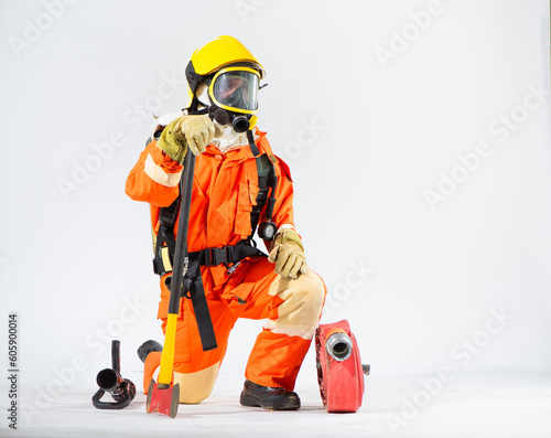 Naklejka premium Professional firefighter is sitting and kneeling down looking sideways and holding an iron axe with one hand while a fire hose is placed on the floor on a white background.