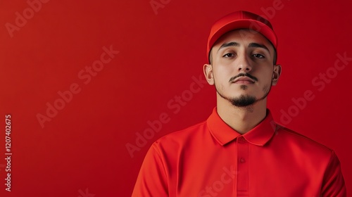 © พงศ์พล วันดี, Fototapeta premium Professional Food Delivery Employee in Uniform Against Vibrant Red Background