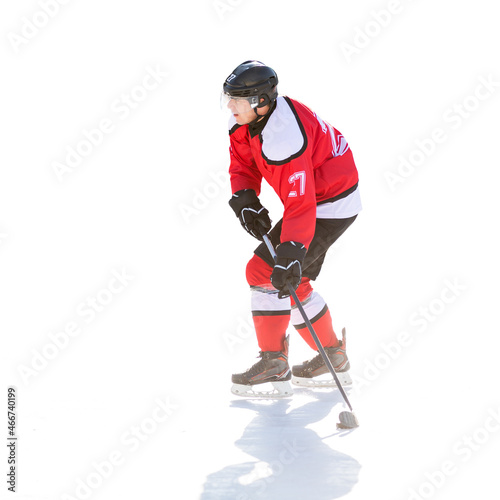 © skumer, Fototapeta premium Professional ice hockey player in attack on the rink. Isolated image on white