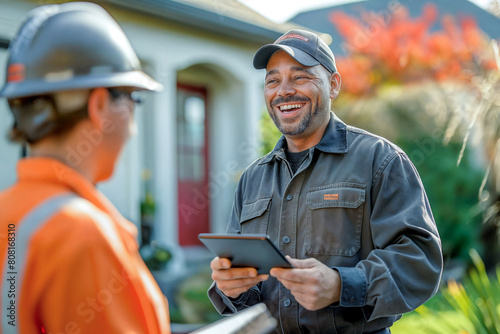Fototapeta premium Professional landscape arborist technician builder contractor using a tablet to communicate with crew on the job site, service industry worker integrating with technology to keep customers happy