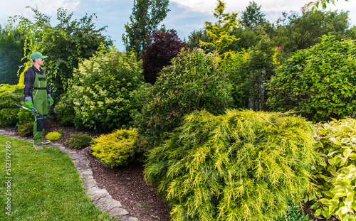 © Tomasz Zajda, Naklejka premium Professional Landscaper in Front of Island Garden Bed