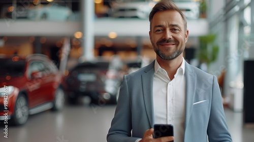 © anatoliycherkas, Fototapeta premium Professional Luxury Car Salesman in Luxury Showroom Holding Smartphone and Smiling