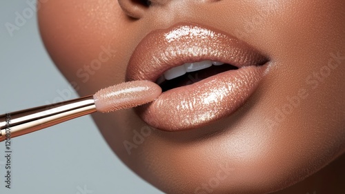 Obraz premium Professional makeup artist applying shimmering gloss, highlighting model's woman lips with glamorous, luminous finish