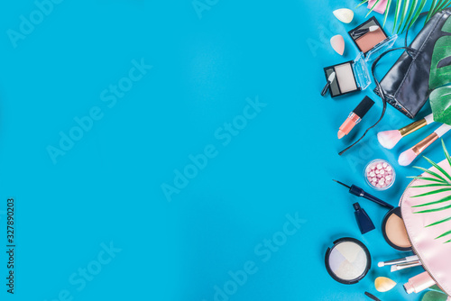 Fototapeta premium Professional makeup cosmetic set, with summer tropical leaves, woman bag. Make up items. luxury decorative cosmetics flatlay, top view, mockup. Beauty blogger concept. Trendy turquoise background