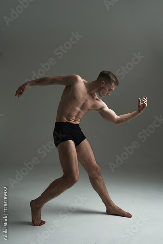 Obraz premium Professional male dancer in motion, performing a contemporary artistic pose with controlled movement, strength, and body expression in a studio