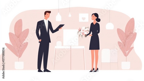 © Wanida, Obraz premium Professional man and woman engage in conversation while showcasing modern interior design, featuring elegant decor elements and a warm, inviting atmosphere