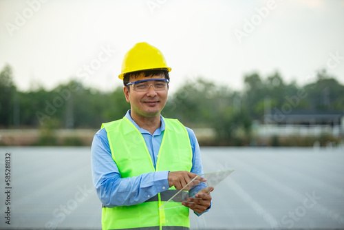 © Chocheng channel, Fototapeta premium Professional man engineer looking away with pleasure smile while working at ecological green field with solar panels. Photovoltaic power station concept