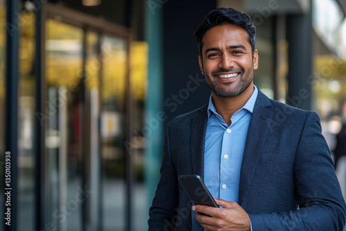 © Bohdan, Naklejka premium Professional man smiling while using smartphone outdoors
