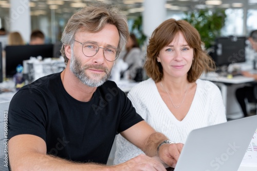 © The Little Hut, Fototapeta premium Professional mature man and woman working together using laptop in modern office environment with colleagues in background