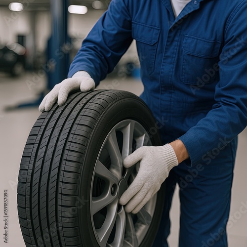 © Generative AI, Fototapeta premium Professional mechanic inspecting installing new car tire with wheel in automotive workshop.