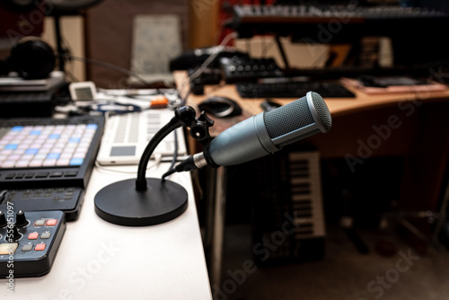 © thomsond, Obraz premium Professional microphone on a working table in a recording studio