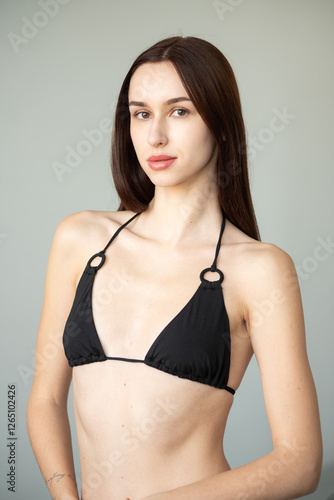© alipko, Fototapeta premium Professional model test shoot for agency submission. Natural beauty, minimal makeup, black bikini, clean background, confident poses. Perfect for portfolios, castings, and fashion industry needs