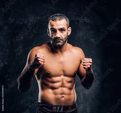 © Fxquadro, Obraz premium Professional Muay Thai boxer with naked torso posing for a camera. Studio photo against a dark textured wall