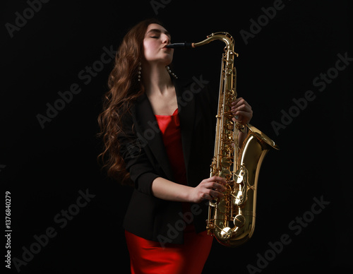 © New Africa, Obraz premium Professional musician playing saxophone on black background
