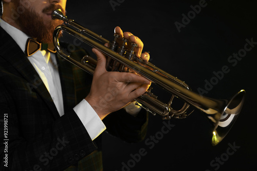 Obraz premium Professional musician playing trumpet on black background, closeup