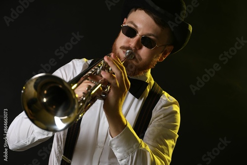 Obraz premium Professional musician playing trumpet on black background in color lights