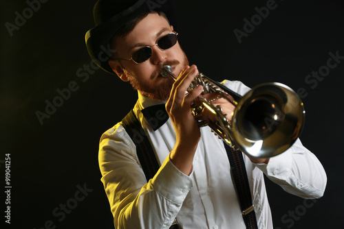 Obraz premium Professional musician playing trumpet on black background in color lights