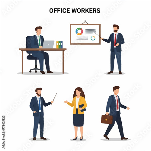 Fototapeta premium Professional office workers engaged in various business activities and presentations.