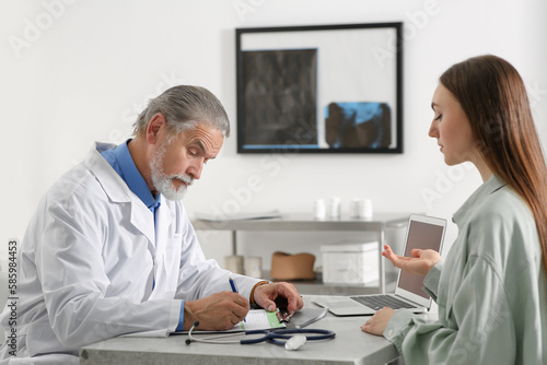 Fototapeta premium Professional orthopedist consulting patient at table in clinic