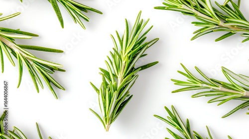 © Darunee, Obraz premium Professional overhead composition with 85mm lens, rosemary sprigs evenly spaced in parallel lines, focus on central section for sharpness, pure white background evenly lit