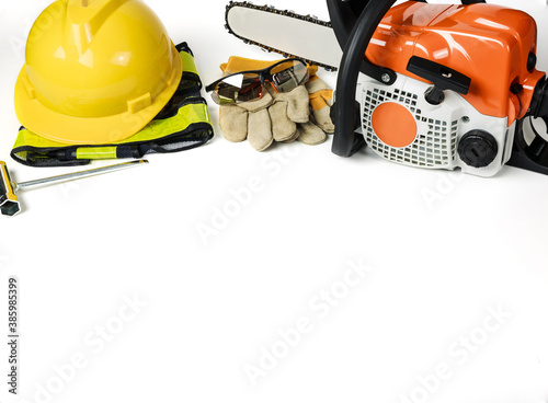 © Kannapat, Fototapeta premium Professional petrol chainsaw isolated on a white background.
