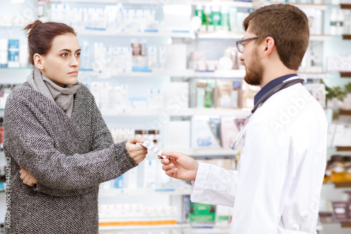 © Nestor, Obraz premium Professional pharmacist working with customers at the drugstore