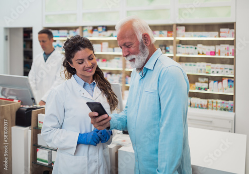 © hedgehog94, Obraz premium Professional pharmacist working with customers in modern drugstore.