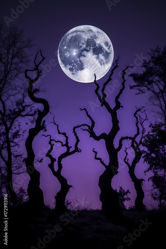 © paul, Fototapeta premium professional photo of a Vertical 9:16 framed spooky forest silhouette with twisted gnarled trees under a glowing full moon a dark purple gradient sky that gradates to a deep indigo towards the top lar