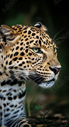 © Mobiles, Fototapeta premium Professional photorealistic low-key profile portrait of a vigilant leopard.