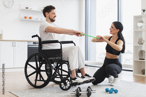 © sofiko14, Obraz premium Professional physiotherapist in sportswear helping adult man with a disability in wheelchair to workout with stretching bands, to recover from injury at home. Rehab fitness for young male patient.