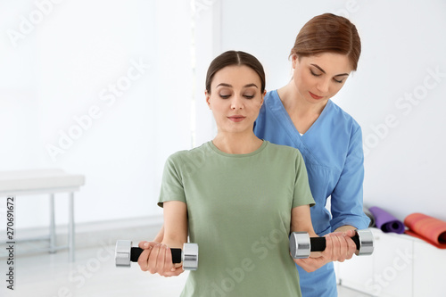 Fototapeta premium Professional physiotherapist working with female patient in rehabilitation center