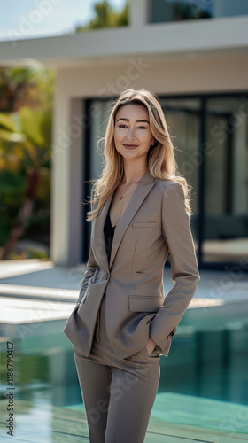 Fototapeta premium Professional real estate agent in stylish suit, standing confidently by modern poolside. serene environment enhances her approachable demeanor