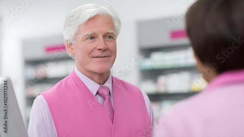 Obraz premium Professional Retail Pharmacist Interaction in Pharmacy Environment with Emphasis on Visual Composition and Color Palette